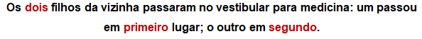 Na frase acima, o numeral “dois” está acompanhando o substantivo “filhos”, atribuindo-lhe a ideia de quantidade, já os numerais “primeiro” e “segundo” estão acompanhando o substantivo “lugar”, atribuindo-lhe a ideia de ordem.