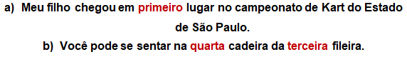 No exemplo a, o numeral “primeiro” está acompanhando o substantivo “lugar”, indicando-lhe a ideia de posição. Já no exemplo b, o numeral “quarta” está acompanhando o substantivo “cadeira”, e o numeral “terceira” está acompanhando o substantivo “fileira”, esses dois numerais, no exemplo b, estão atribuindo aos substantivos, que eles acompanham, a ideia de sequência.