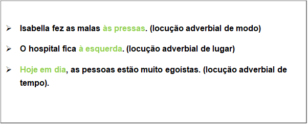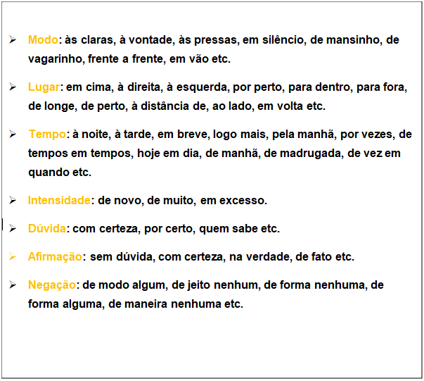 Verifique, agora, algumas locuções adverbiais e suas classificações.