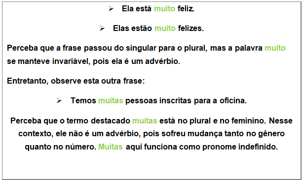 Os advérbios são invariáveis, eles não sofrem flexão em relação ao gênero (feminino/masculino) e ao número (singular/plural), mas, em relação ao grau, sim. Daqui a pouco, entraremos nesse assunto.